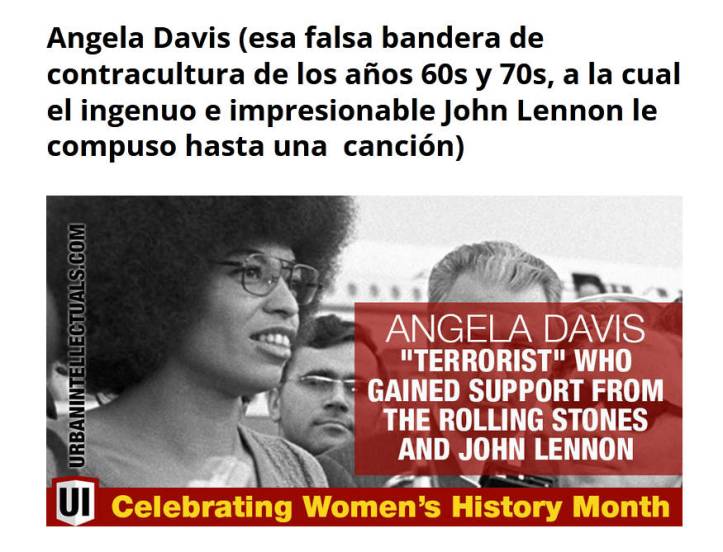 NOTA MIA: No he visto que nadie lo haga, así que quizás tenga que hacer yo una minibiografía de Angela Davis, la otra falsa bandera de los 70s, financiada por el mismo George Soros, a la cual el ingenuo e impresionable John Lennon, le compuso hasta una canción. (Dejo algunas imágenes de Davis al final del post)