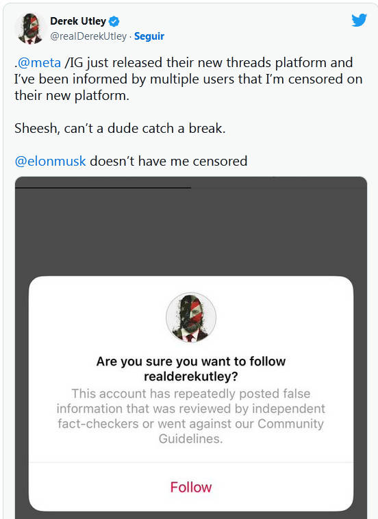 Pero la censura ya está ocurriendo, dijo Iversen, compartiendo un tweet de Derek Utley informando a los seguidores que los usuarios de Threads lo alertaron de que está siendo censurado.