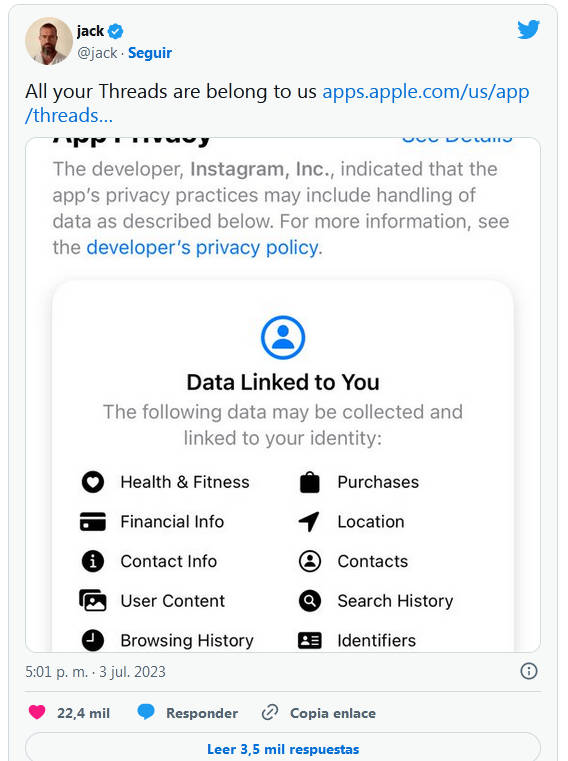 Threads también está recopilando una gran cantidad de datos de usuarios. Iversen mostró el tweet del fundador de Twitter, Jack Dorsey , publicando todos los datos que Meta recopila de sus usuarios, que incluyen salud y estado físico, datos financieros, datos de ubicación, historial de búsqueda, contactos, historial de compras y más.