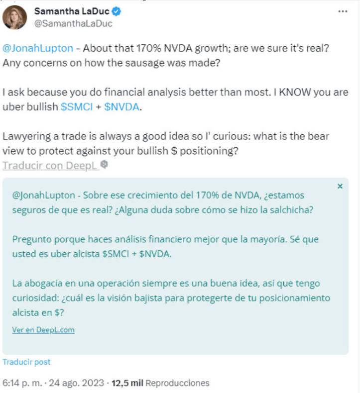 Antes de profundizar, es importante señalar que Samantha ha aconsejado a sus clientes que se pongan cortos en NVIDIA, lo que indica que tiene intereses creados en este asunto.