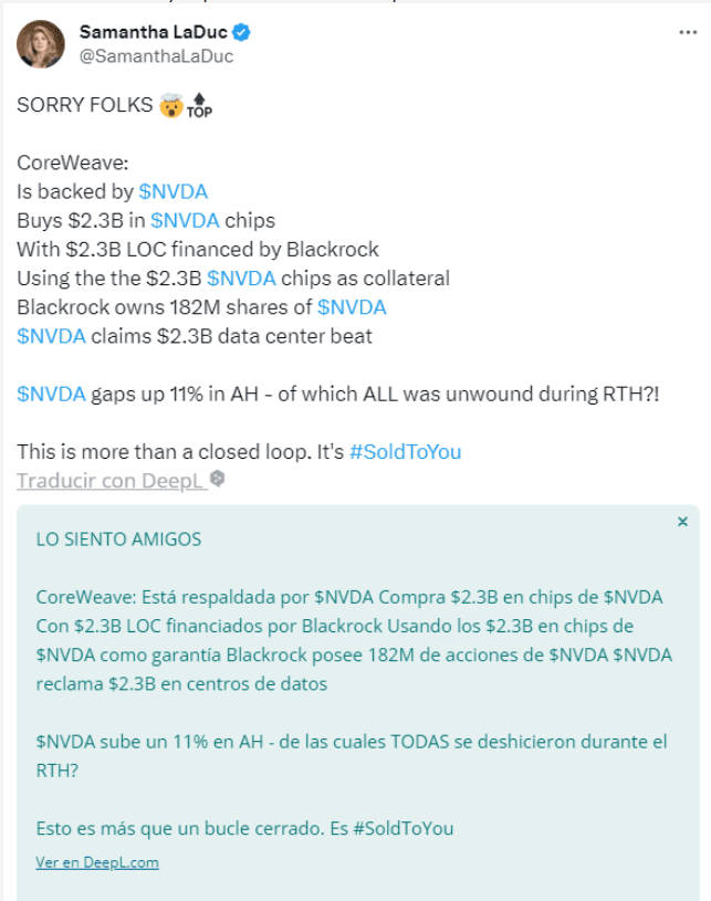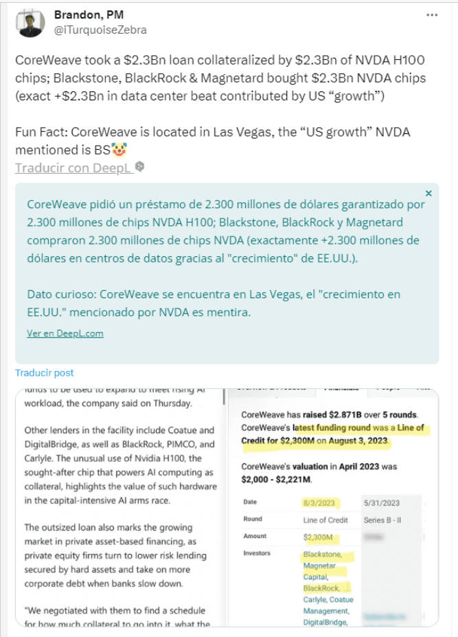 Empezaron a surgir datos muy interesantes, empezando por una línea de crédito de 2.300 millones de dólares concedida a una empresa llamada Coreweave, cliente de NVIDIA. La trama se complica.