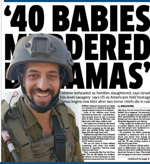 Una protesta internacional estalló cuando el Ministerio de Asuntos Exteriores de Israel anunció que militantes palestinos de la asediada Franja de Gaza habían matado a 40 “bebés” y decapitado a varios de ellos durante una incursión en Kfar Aza, un kibutz en la frontera de Gaza. El presidente Joseph Biden repitió la incendiaria afirmación durante un discurso en el Jardín de las Rosas de la Casa Blanca el 10 de octubre , mientras que las redes de todo Occidente difundieron la historia sin el más mínimo escrutinio crítico.