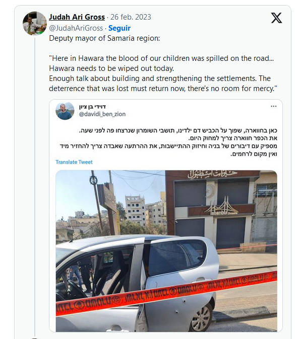 Ben David fue citado en los medios israelíes proclamando poco después: “La aldea de Huwara debería ser aniquilada, este lugar es un nido de terror y el castigo debería ser para todos”, un claro llamado al castigo colectivo de los palestinos.
