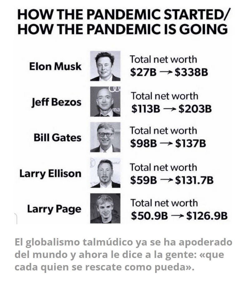 Para apoyar a sus cómplices de la OMS y el FEM, a principios del verano pasado personas de ideas afines de la ONU declararon peligrosos todos los temas que no les gustaban, llamándolos «teorías de conspiración». Desde entonces, cualquier ciudadano respetable, desde el punto de vista de Schwab, Gates y otros cabilderos de la «nueva normalidad», debe partir del hecho de que no hay una élite mundial, ni globalistas que manipulen en secreto los acontecimientos que tienen lugar en el mundo, los poderes fácticos son exclusivamente personas honestas, solidarias y abiertas, y Soros, Gates, los Rothschild, el Estado de Israel, etc. no pueden de ninguna manera conectarse con ninguna «supuesta conspiración».