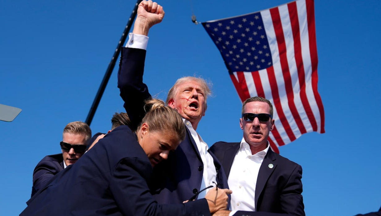 1- Por cierto, por protocolo de seguridad, cuando los guardaespaldas cubren a una persona del peligro lo hacen hasta que la víctima está en zona segura, PERO… Nuevamente aquí la seguridad MOSSAD de Trump falla y le dejan asomarse para dejarle hacer un gesto de lucha.