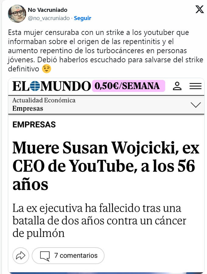 Susan Wojcicki, ex directora ejecutiva de YouTube que defendió la eliminación de plataformas y la censura como herramienta de ingeniería social, murió de cáncer de pulmón a los 56 años el viernes.