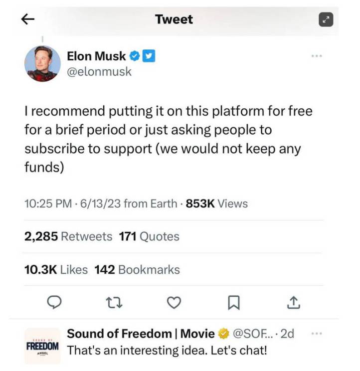 Incluso el multimillonario cohetero de Twitter, Elon Musk, se subió al carro y está desconcertado por la película, ofreciéndose a presentarla en Twitter de forma gratuita: