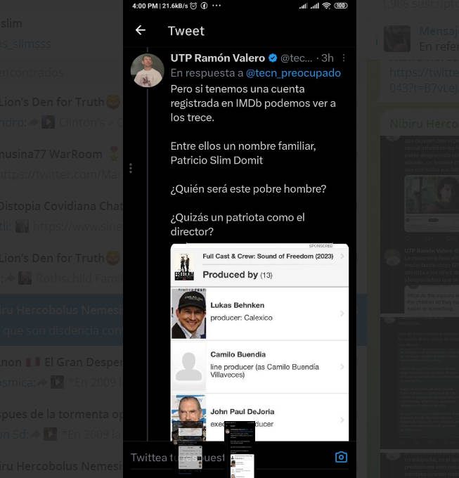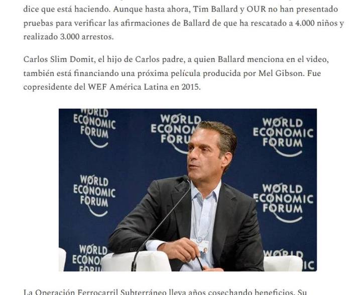Carlos Slim Domit, el hijo de Carlos padre, a quien Ballard menciona en el video, también está financiando una próxima película producida por Mel Gibson. Fue copresidente del WEF América Latina en 2015.