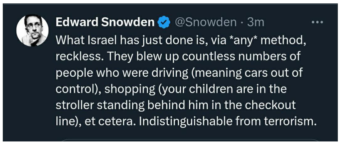 Edward Snowden lo califica de «indistinguible del terrorismo». Yo lo llamo terrorismo de Estado, por parte de Israel, el Estado más cruel del planeta.