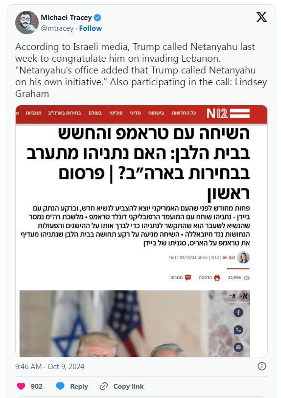 Trump “llamó a Netanyahu la semana pasada y ‘lo felicitó por las intensas y decididas operaciones que Israel llevó a cabo contra Hezbolá’, según la oficina de Netanyahu”, informó AP el martes.