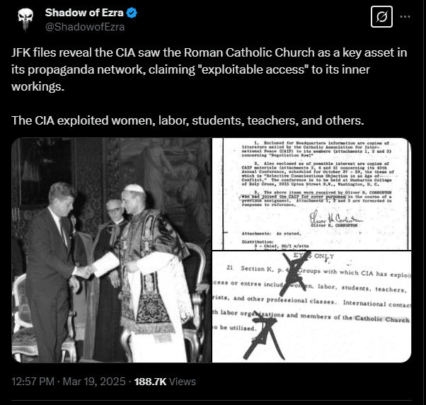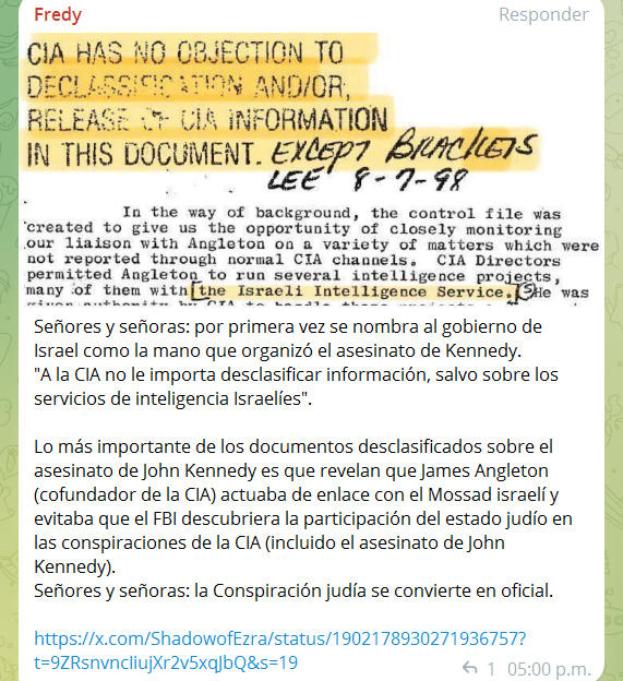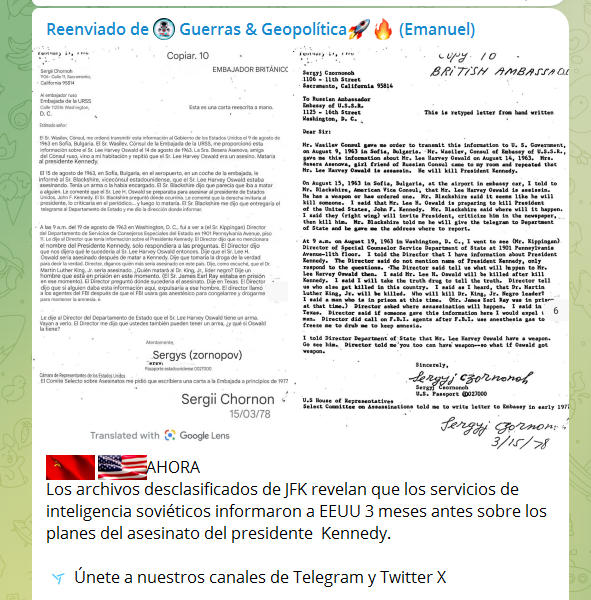 19 marzo, 202519 marzo, 2025 lizama BREAKING NEWS: Aquí, todos los archivos «desclasificados» sobre la muerte de JFK 63.400 páginas repartidas en 2182 archivos. LINK OFICIAL https://www.archives.gov/research/jfk/release-2025 Comparte esto: Haz clic para compartir en VK (Se abre en una ventana nueva) VK Haz clic para compartir en Reddit (Se abre en una ventana nueva) Reddit Haz clic para compartir en Telegram (Se abre en una ventana nueva) Telegram Me gusta Cargando... Relacionado