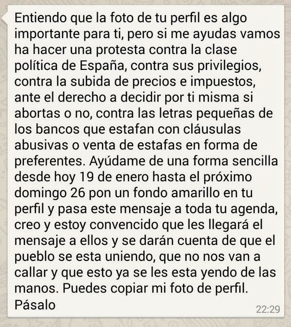 En España han subido impuestos, hay desempleo juvenil, bajos salarios, brecha de ingresos, LRAD (cañones de sonido) para atacar a manifestantes, seguridad privada que puede detener a culaquiera, altos indices de corrupción (2 lugar); pero mañana whatsapp y el color amarillo harán que el Gobierno de Rajoy se asuste, piense mejor las cosas, se de cuenta que «se está pasando» y poco a poco comience a ser distinto !MÁS DEMOCRÁTICO¡