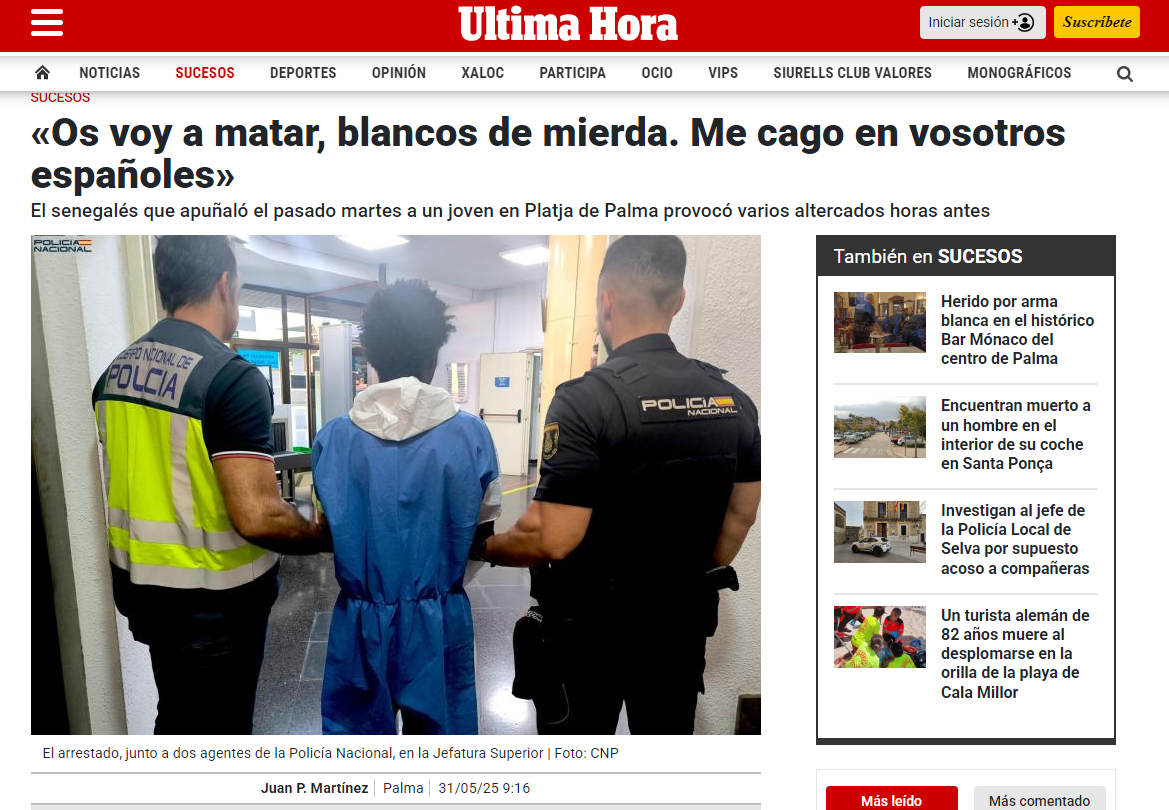 El senegalés detenido por la Policía Nacional, y enviado horas después a prisión, tras apuñalar gravemente con unas tijeras por la espalda a un joven neerlandés en Playa de Palma protagonizó un par de horas antes un grave altercado con trabajadores y clientes en un restaurante cercano. «Os voy a matar, blancos de mierda», «me cago en vosotros españoles», soltó ante la atónita mirada de decenas de personas.