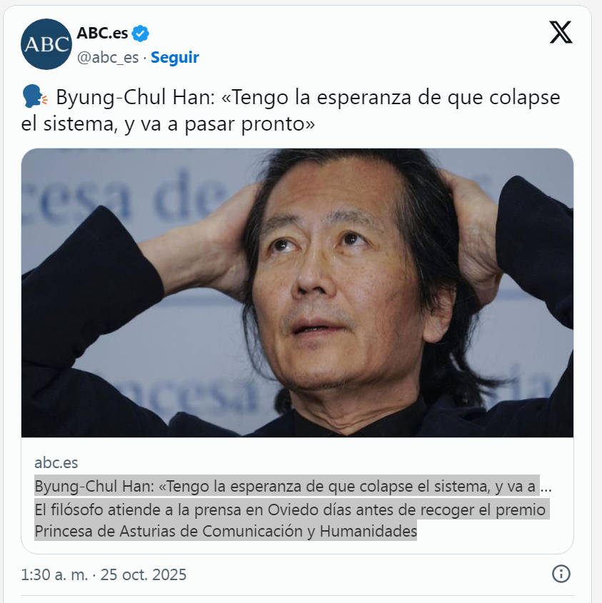 Chul Han justo ahora, que gana un premio, predica y desea el “colapso deseable” del capitalismo tardío… justo como lo requiere la estrategia de disrupción controlada de Silicon Valley, BlackRock y el Foro Económico Mundial.