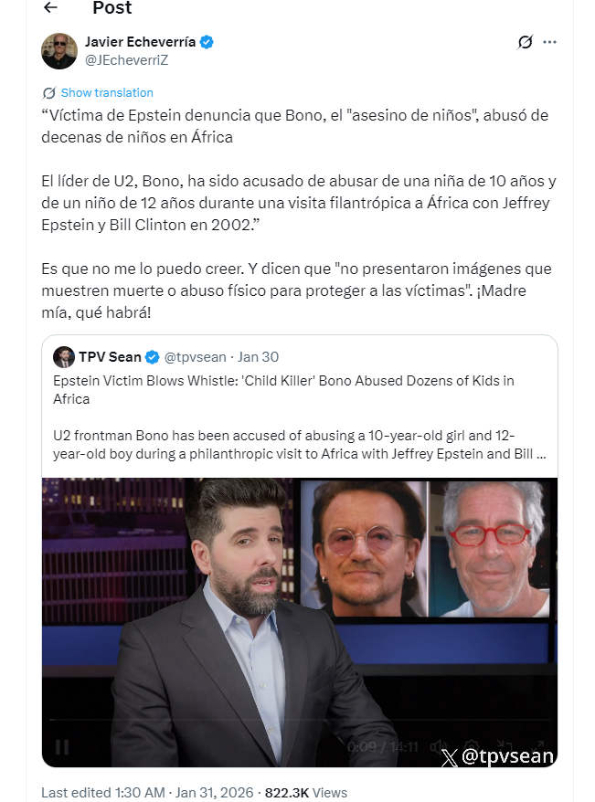 Víctima de Epstein denuncia que Bono, el «asesino de niños», abusó de decenas de niños en África El líder de U2, Bono, ha sido acusado de abusar de una niña de 10 años y de un niño de 12 años durante una visita filantrópica a África con Jeffrey Epstein y Bill Clinton en 2002.” Es que no me lo puedo creer. Y dicen que «no presentaron imágenes que muestren muerte o abuso físico para proteger a las víctimas». ¡Madre mía, qué habrá!